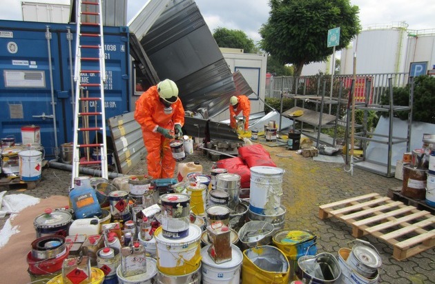 Am Montag gegen 12:30 Uhr ging bei der Leitstelle der Feuerwehr Mülheim eine Information über auslaufende Gefahrstoffe auf einem Betriebsgelände im Hafengebiet ein. Unverzüglich wurde ein Führungsdienst und der Gefahrgutzug zur Einsatzstelle entsandt. Auf einem Betriebsgelände im Hafengebiet war bei Umladearbeiten mit einem Kran ein gefüllter Lagercontainer für Lösungsmittel und Lacke umgekippt. Durch den Aufprall wurde der Container zerstört und die darin befindlichen Kleingebinde verteilten sich auf dem Betriebsgelände. Dabei wurde ein Großteil der Behältnisse für Lacke, Lösemittel und Öle beschädigt.Durch die Feuerwehr wurden die leck geschlagenen Behältnisse unter Schutzanzügen und mit Atemschutz in fünf große Sicherheitsheitscontainer verpackt und sichergestellt. Ein weiteres Ausbreiten von umweltgefährlichen Stoffen konnte somit verhindert werden. Das Umweltamt und die Polizei haben weitere Ermittlungen aufgenommen. Bei dem Zwischenfall auf dem Betriebsgelände wurden keine Personen verletzt. Der Einsatz war für die Feuerwehr nach zirka zweieinhalb Stunden beendet. (HJF)