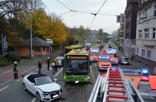 Heute Morgen kam es um 08.02 Uhr auf der Duisburger Straße zu einem schweren Verkehrsunfall. Ein voll besetzter Linienbus und ein PKW stießen frontal zusammen. Dabei wurden im Bus 13 Personen verletzt. Unter den Verletzten befanden sich drei Kinder. Ein Kind und eine erwachsene Person wurden schwer, 11 weitere Personen leicht verletzt. Die drei Insassen des PKW wurden leicht verletzt. Die Verletzten wurden in Mülheimer, Essener, Oberhausener und Duisburger Krankenhäuser transportiert. Zu den 16 Verletzen kamen noch 13 weitere Personen die vom Unfall betroffen aber nicht verletzt waren.
