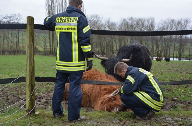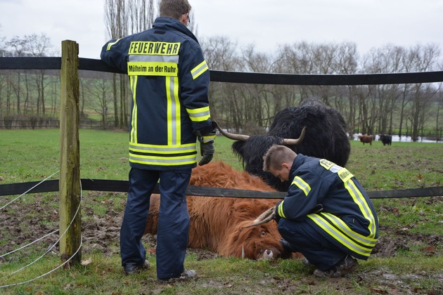 Am heutigen Montag alarmierte eine Spaziergängerin um 11.50 Uhr die Feuerwehr Mülheim. Sie meldete, dass sich auf dem Auberg ein Galloway-Rind in einem Elektrozaun verfangen habe und sich nicht mehr selbstständig befreien könne. Die Einsatzkräfte fanden eine völlig erschöpfte, auf der Seite liegende Kuh vor. Ein Seil eines Elektrozaunes hatte sich um ihren Hals sowie um die Hörner gewickelt. Betreut wurde sie in dieser Situation von Ihrem stattlichen männlichen Weidegenossen. Diese nicht alltägliche und auch bedrohliche Situation lösten die Einsatzkräfte durch eine etwas lautere Ansprache an den Bullen. Dieser ließ sich dann auch davon überzeugen ein wenig Abstand zu nehmen. Durch Zertrennen des Zaunes konnte die Kuh schließlich aus Ihrer misslichen Lage befreit werden. Bis zum Eintreffen des Tierarztes und des Besitzers wurde die Kuh von den Einsatzkräften in Zusammenarbeit mit dem Bullen betreut. Anschließend wurde die Einsatzstelle den Besitzer übergeben. Wir hoffen dass die beiden Rindviecher schon bald wieder gemeinsam über die Wiesen ziehen können. (TDr)