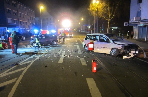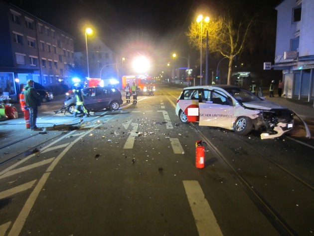 Gegen 1.30 Uhr wurde die Leitstelle der Feuerwehr Mülheim an der Ruhr über einen Verkehrsunfall mit eingeklemmten Personen im Kreuzungsbereich der Aktienstraße / Sandstraße in Kenntnis gesetzt. Bei Eintreffen der Einsatzkräfte, waren zwei PKW im Kreuzungsbereich aus noch ungeklärter Ursache zusammengestoßen.