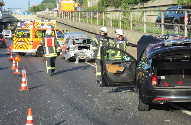 Am Dienstagabend gegen 19:00 Uhr wurde der Leitstelle der Feuerwehr Mülheim an der Ruhr ein Verkehrsunfall auf der Bundesautobahn 40 in Höhe der Abfahrt Essen/Frohnhausen in Fahrtrichtung Essen gemeldet. Bei Eintreffen der Einsatzkräfte waren drei Fahrzeuge aus noch ungeklärter Ursache aufeinander gefahren. Betroffen waren alle drei Fahrzeugführer, die sich jeweils alleine in ihrem Auto befanden. Alle wurden vom eintreffenden Rettungsdienst und einem Notarzt versorgt. Zwei Patienten wurden vorsorglich zur Uniklinik Essen transportiert. Ein Fahrer kam mit dem Schrecken davon und konnte an der Unfallstelle verbleiben. Die Einsatzkräfte der Feuerwehr sicherten die Einsatzstelle gegen den Verkehr ab, streuten Teile der Fahrbahn mit Ölbindemittel ab, da Betriebsstoffe aus den verunfallten Personenkraftwagen liefen und stellten während des Einsatzes den Brandschutz sicher. Im Anschluss wurden die Fahrbahnen von umherliegenden Karosserieteilen und Glassplitter von der Feuerwehr gereinigt. Der Verkehr wurde während des Einsatzes einspurig an der Unfallstelle vorbeigeleitet. Nach zirka einer Stunde wurde die Einsatzstelle der Polizei übergeben. Während des Einsatzes kam es zu starken Verkehrsbehinderungen auf der BAB 40 in Fahrtrichtung Essen. (CLe)