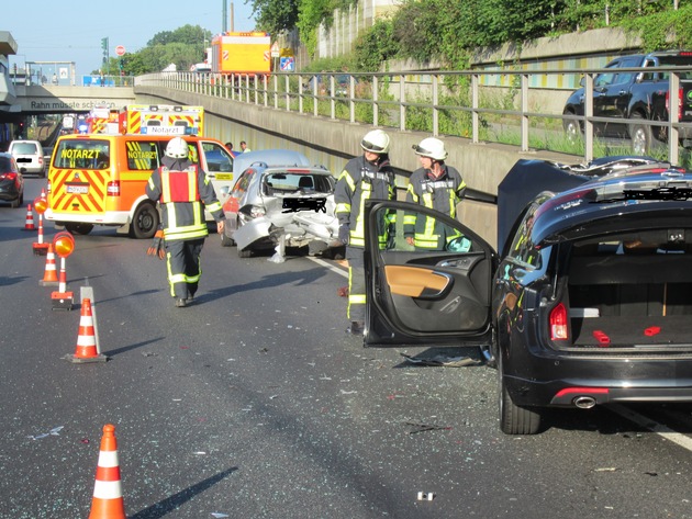Am Dienstagabend gegen 19:00 Uhr wurde der Leitstelle der Feuerwehr Mülheim an der Ruhr ein Verkehrsunfall auf der Bundesautobahn 40 in Höhe der Abfahrt Essen/Frohnhausen in Fahrtrichtung Essen gemeldet. Bei Eintreffen der Einsatzkräfte waren drei Fahrzeuge aus noch ungeklärter Ursache aufeinander gefahren. Betroffen waren alle drei Fahrzeugführer, die sich jeweils alleine in ihrem Auto befanden. Alle wurden vom eintreffenden Rettungsdienst und einem Notarzt versorgt. Zwei Patienten wurden vorsorglich zur Uniklinik Essen transportiert. Ein Fahrer kam mit dem Schrecken davon und konnte an der Unfallstelle verbleiben. Die Einsatzkräfte der Feuerwehr sicherten die Einsatzstelle gegen den Verkehr ab, streuten Teile der Fahrbahn mit Ölbindemittel ab, da Betriebsstoffe aus den verunfallten Personenkraftwagen liefen und stellten während des Einsatzes den Brandschutz sicher. Im Anschluss wurden die Fahrbahnen von umherliegenden Karosserieteilen und Glassplitter von der Feuerwehr gereinigt. Der Verkehr wurde während des Einsatzes einspurig an der Unfallstelle vorbeigeleitet. Nach zirka einer Stunde wurde die Einsatzstelle der Polizei übergeben. Während des Einsatzes kam es zu starken Verkehrsbehinderungen auf der BAB 40 in Fahrtrichtung Essen. (CLe)
