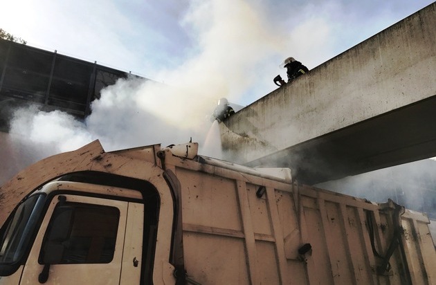 Die Feuerwehr Bonn wurde um 15:18 auf das Gelände des Bonner Polizeipräsidiums in Ramersdorf alarmiert. Ein Müllfahrzeug hatte sich, bedingt durch einen technischen Defekt, unter einer Fußgängerbrücke auf dem Gelände verkeilt. Ein Verfahren des LKW war nicht möglich, sodass Werkstattpersonal der betroffenen Firma hinzugezogen wurde. Im Rahmen der Bergung geriet der gepresste Müll in Brand. Durch die alarmierte Feuerwehr wurde die Außenhaut des LKW gekühlt sowie ein Löschrohr von der Brücke bzw. über tragbare Leitern vorgenommen. Im Anschluss konnte die Bergung unterstützt werden. Der LKW wurde nach Abschluss der Löscharbeiten zur Müllverwertungsanlage begleitet. Der Einsatz der 15 Einsatzkräfte der Feuerwachen 1 und 2 endete gegen 16:20.