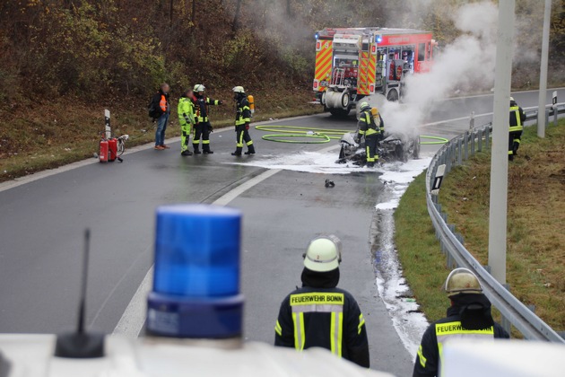 Am heutigen Donnerstagmittag (30.11.2017) ging in der Leitstelle von Feuerwehr und Rettungsdienst Bonn um 11.43 Uhr der Notruf über einen brennenden Pkw am Autobahnkreuz Bonn-Nord ein. Bei Eintreffen der Feuerwehr stand der Sportwagen bereits komplett in Flammen. Mit Wasser und Schaummittel sowie mit Speziallöschpulver für Metallbrände machten die Einsatzkräfte unter Atemschutz den Flammen den Garaus. Nach der Bergung des ausgebrannten Fahrzeugwracks durch den Abschleppdienst reinigten die Einsatzkräfte die Fahrbahn von den Löschmitteln.