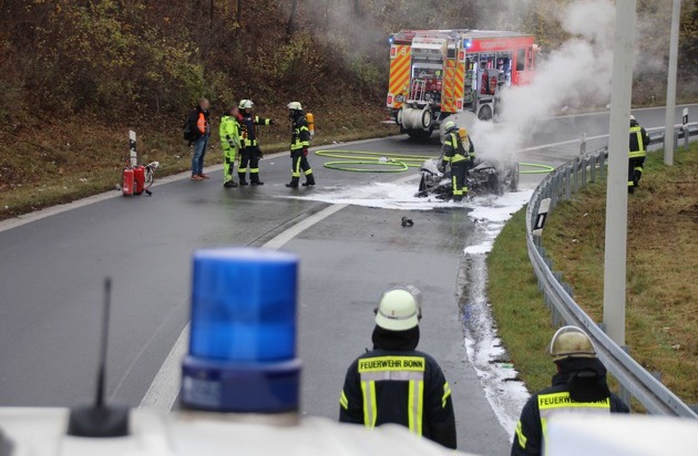 Der Fahrer des Pkws hatte sich und seinen Hund noch rechtzeitig in Sicherheit bringen können. Beide blieben unverletzt. Damit die Einsatzkräfte sicher arbeiten konnten und die weiteren Verkehrsteilnehmer durch das Feuer und den Rauch nicht gefährdet wurden, sperrte die Polizei die Überleitung bis zum Ende des Einsatzes gegen 13 Uhr komplett. Im Einsatz waren neun Einsatzkräfte der Feuerwache 2 der Berufsfeuerwehr Bonn.
