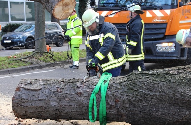 Für einen größeren Einsatz sorgten die Sturmböen auf dem Kaiser-Karl-Ring in der Nordstadt. Ein auf einen Pkw und die aufgespannten Leitungen der Straßenbeleuchtung umgestürzter Baum blockierte alle Fahrspuren in Höhe der Alemannenstraße. Der Fahrer des Pkws konnte sich unverletzt aus seinem Fahrzeug retten. Er kam mit dem Schrecken davon. Einsatzkräfte der Feuerwehr kümmerten sich gemeinsam mit Einsatztrupps der Stadtwerke Bonn um die Beseitigung des Baumes. Insgesamt waren Einsatzkräfte aller Feuer- und Rettungswachen der Berufsfeuerwehr, aller Löscheinheiten der Freiwilligen Feuerwehr sowie des Führungsdienstes im Einsatz.