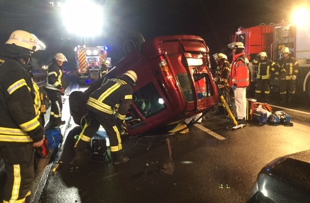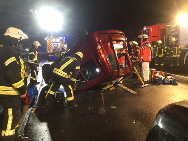 Bei Eintreffen der Feuerwehrkräfte wurde ein auf dem Dach liegender PKW vorgefunden. Im Inneren befand sich eine verletzte Person, die sich selber nicht befreien konnte. Nach Rücksprache mit dem eingetroffenen Notarzt wurde durch die Feuerwehr die technische Rettung der Person vorbereitet. Nach der Sicherung des Fahrzeuges mittels Abstützsystem und Entfernung der Fahrertüre konnte die Person dann schonend aus dem Fahrzeug befreit werden. Im Anschluss der Versorgung durch die Kräfte des Rettungsdienstes wurde die Patientin in ein Krankenhaus transportiert. Im Einsatz waren neben dem Einsatzführungsdienst, Kräfte der Feuerwachen 1 und 2 sowie dem Rettungsdienst. Während der Rettungsmaßnahmen war die Autobahn durch die Feuerwehr in Fahrtrichtung Königswinter vollständig gesperrt worden.