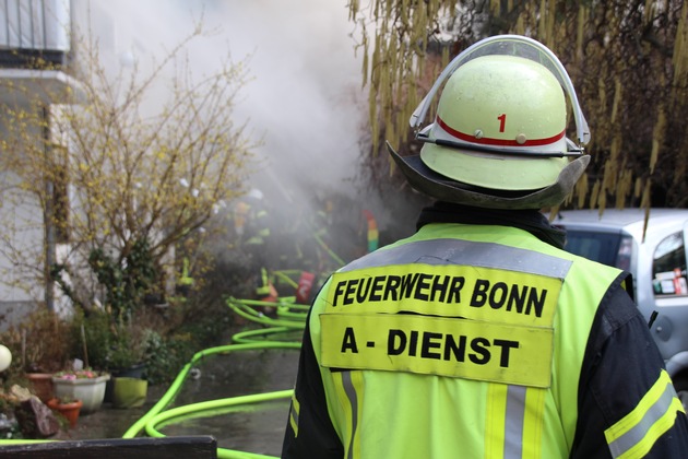 Bonn-Nordstadt, Ellerstraße, 21.03.2018, 11:54 Uhr - Am Mittwochmittag (21.03.2018) meldeten mehrere Anrufer den Brand eines Wohngebäudes an der Ellerstraße. Bei Eintreffen der Feuerwehr standen das Haupthaus und ein hölzerner Anbau in Flammen. Die Einsatzkräfte der Feuerwehr fanden in dem brennenden Gebäude eine Person vor, für die jede Hilfe zu spät kam.