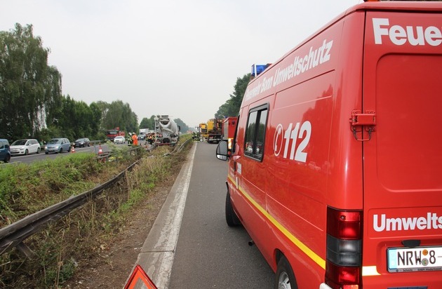 Als die ersten Rettungskräfte die Unfallstelle erreichten, war der Fahrer des Lkws bereits außerhalb seines Fahrzeugs. Unfallzeugen leisteten ihm Erste Hilfe. Die Besatzung eines Rettungswagens und der Notarzt behandelten den Fahrzeuglenker weiter, bevor sie ihn mit leichten Verletzungen in ein Krankenhaus brachten. Weil aus dem aufgerissenen Dieseltank des Lkws der Kraftstoff auslief und das Erdreich verunreinigte, rückten auch Spezialfahrzeuge der Umweltwache der Bonner Feuerwehr auf die Autobahn aus. Rund 110 Liter Dieselkraftstoff konnten die Spezialisten so auffangen und in bereitgestellte Fässer umpumpen. Ein wegen der Brandgefahr vorsorglich aufgebauter Löschangriff musste nicht zum Einsatz kommen.