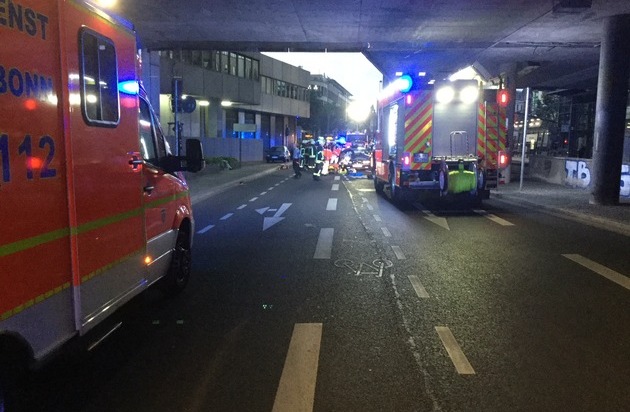 Bonn, Berliner Platz. Am Abend des 22.06.2018 liefen viele Notrufe bei der Leitstelle von Feuerwehr und Rettungsdienst über ein Verkehrsunfall zwischen einem PKW und einem Fußgänger ein. Beim Eintreffen der Einsatzkräfte betreuten Ersthelfer vorbildlich den schwerverletzten Patienten, der im Frontbereich des PKW eingeklemmt war. Zwei Insassen des Fahrzeuges wurden leicht verletzt. Nach der Stabilisierung des Fahrzeuges leiteten Feuerwehr und Rettungsdienst die patientenorientierte Rettung ein. Der Patient wurde mit einem Rettungswagen in ein Bonner Krankenhaus transportiert. Im Einsatz waren 21 Kräfte der Berufsfeuerwehr und des Rettungsdienstes.