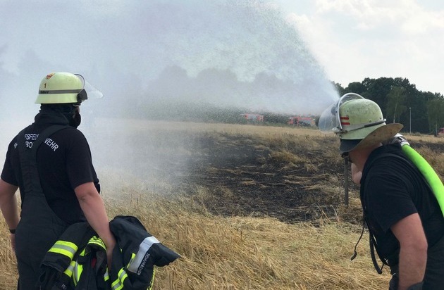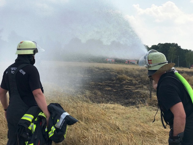 06.07.2018, 14:31 Uhr Bonn, Rheinstrom Höhe Castell; Lengsdorf, Im Mühlenbach Bei weiterhin sommerlichen Temperaturen ist die Feuerwehr Bonn am Freitagnachmittag in kurzem Abstand zu zwei Einsätzen gerufen worden. Um 14:31 Uhr meldeten Anrufer eine Person, die im Rhein nördlich der Kennedybrücke schwamm. Die ersten Einsatzkräfte bestätigten eine Person im Rhein, die sich in Lebensgefahr brachte, indem sie sich weit vom Ufer entfernt nahe der Fahrrinne der Schiffe befand. Mit Hilfe eines Megafons wurde der Schwimmer aufgefordert sich an Land zu begeben, was er auch kurzerhand tat. Parallel wurde ein Mehrzweckboot entsandt, die Besatzung informierte die Person ebenfalls über die möglichen Gefahren im Rheinstrom. Feuerwehr und Rettungsdienst können an dieser Stelle wiederholt nur davon abraten im Rhein schwimmen zu gehen. Untiefen, Strudel und die starke Strömung können selbst geübte Schwimmer in Lebensgefahr bringen. Im Einsatz waren 23 Einsatzkräfte von den Feuer- und Rettungswachen 1,2 und 3. Um 14:52 Uhr, noch während des laufenden Einsatzes am Rhein, meldeten Anrufer einen ausgedehnten Flächenbrand in Lengsdorf. Hier gerieten nahe der Straße Im Mühlenbach rund 2000m² (Fläche/Feld) in Brand. Ein Großaufgebot von Berufs- und Freiwilliger Feuerwehr bekämpfte das Feuer in drei Einsatzabschnitten mit mehreren handgeführten Strahlrohren. Ein leichtverletzter Feuerwehrmann wurde durch den Rettungsdienst vor Ort behandelt. Zur Versorgung der Einsatzkräfte mit ausreichend Getränken wurde frühzeitig eine Versorgungseinheit alarmiert. Vor Ort waren rund 60 Einsatzkräfte der Feuerwachen 1,2 und 3, der Führungsdienst, der Rettungsdienst und die Löscheinheiten der Freiwilligen Feuerwehr aus Lengsdorf und Duisdorf im Einsatz. Zur Sicherung des Grundschutzes besetzten insgesamt 15 Einsatzkräfte der Löscheinheiten Buschdorf, Holzlar und Holtorf der Freiwilligen Feuerwehr die Feuerwache 1. Die Maßnahmen an der Einsatzstelle waren gegen 17:00 Uhr beendet.