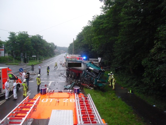 Die Feuerwehr Bottrop wurde am frühen Samstagmorgen zu einem Verkehrsunfall auf der Prosperstraße in Höhe der Kokerei gerufen. Hier waren zwei Sattelzüge frontal kollidiert. Glücklicherweise wurde keiner der drei Insassen der Sattelzüge im Fahrzeug eingeklemmt. Insgesamt wurden jedoch zwei Insassen mittelschwer verletzt, vom Rettungsdienst der Feuerwehr Bottrop versorgt und in umliegende Krankenhäuser verbracht. Im Einsatzverlauf wurden auslaufende Betriebsmittel aufgenommen, der Tankinhalt eines LKW in einen anderen Behälter umgepumpt, die Bergungsarbeiten unterstützt sowie der Brandschutz sichergestellt. Insgesamt war die Feuerwehr Bottrop mit ca. 25 Einsatzkräften vor Ort. Unterstützt wurde die Berufsfeuerwehr von Kräften der Freiwilligen Feuerwehr Altstadt sowie Boy. Während des Einsatzes von Feuerwehr und Polizei war die Prosperstraße für ca. 3 Stunden voll gesperrt. Die Polizei hat Ermittlungen zur Unfallursache aufgenommen.