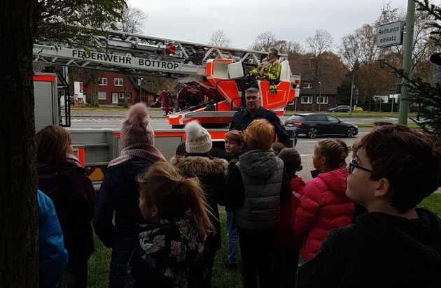 Ab heute wird der Weihnachtsbaum vor der Feuer- und Rettungswache 1 wieder wie jedes Jahr erstrahlen. Für besonderen Glanz sorgen diesmal die Schülerinnen und Schüler der Astrid-Lindgren-Grundschule, die am letzten Donnerstag den Baum mit selbstgebastelten Sternen schmückten. Auf den Sternen hatten sie zuvor im Unterricht ihre Wünsche notiert. Damit die Kinder auch die höheren Äste der Tanne erreichten, fuhr Feuerwehrmann Thorsten Goedecke die Mädchen und Jungen mit der Drehleiter zu den Ästen. Nach getaner Arbeit stärkten sich alle Beteiligten auf der Feuerwache noch mit Plätzchen und Kakao, ehe es für die Schülerinnen und Schüler zurück zu ihrer Schule ging. Die Feuerwehr Bottrop bedankt sich bei ganz herzlich bei der Astrid-Lindgren-Schule und wünscht allen Bottropern eine schöne Adventszeit!