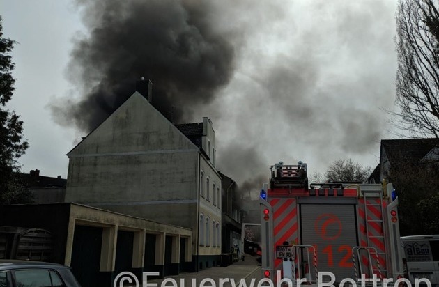 Um 13:32 Uhr wurde die Feuerwehr Bottrop zu einem ausgedehnten Gebäudebrand an der Straße "Am Schlangenholt" in Bottrop-Eigen gerufen. Bereits auf der Anfahrt war eine massive Rauchentwicklung sichtbar. Beim Eintreffen brannte es im 1. und 2. Obergeschoss eines Wohn- und Geschäftshauses. In den ersten Minuten des Einsatzes war unklar, ob noch Personen im Gebäude waren. Deswegen gingen sofort Einsatzkräfte unter Atemschutz in den brennenden Bereich vor. Da sich die Einsatzkräfte den Weg ins Obergeschoss erst mühsam durch herabgefallene brennende Teile freikämpfen mussten, fuhr die Drehleiter die Fenster des brennenden Bereiches ab. Parallel wurden weitere Einsatzkräfte zur Unterstützung alarmiert. Es stellte sich während der Erkundung heraus, dass das Gebäude sich bis zur Gladbecker Straße erstreckte. Aus diesem Grund wurde von dieser Seite ebenfalls ein Angriff vorgetragen. Hier konnten zwei Personen (weiblich, 50 Jahre und männlich, 27 Jahre) gerettet werden, die Rauch eingeatmet hatten. Beide Personen wurden vorsorglich ins Krankenhaus transportiert. Alle weiteren Personen hatten sich bereits ins Freie gerettet. Das Feuer wurde über beide Angriffswege bekämpft. Ca. 1,5 Stunden nach Ausbruch des Brandes war das Feuer unter Kontrolle. Nach Abschluss der umfangreichen Nachlöscharbeiten wurde die Einsatzstelle gegen 16:10 Uhr der Polizei zur Ermittlung der Brandursache übergeben.