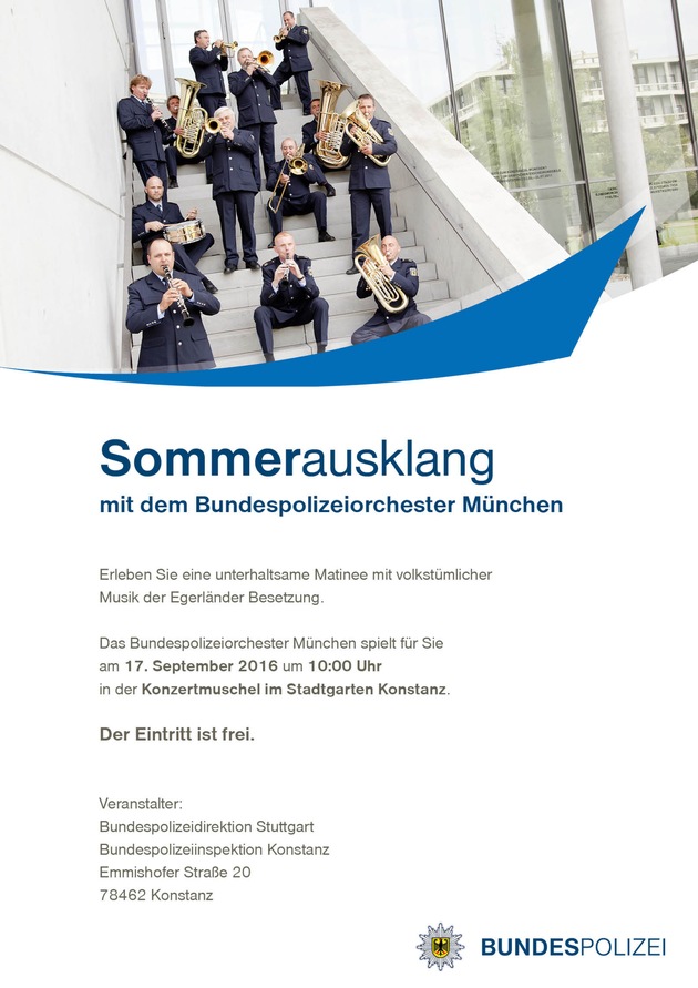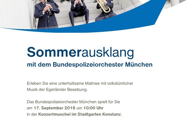 Am 17. September wird das Bundespolizeiorchester München bereits zum zweiten Mal in diesem Jahr ein Konzert in Konstanz geben. Zum "Sommerausklang" wird diesmal die Egerländer Besetzung zu Gast in der Konzertmuschel des Stadtgartens sein. Alle Bürgerinnen und Bürger sowie Besucher der Stadt Konstanz sind herzlich eingeladen, eine unterhaltsame Matinee mit volkstümlicher Musik zu erleben.