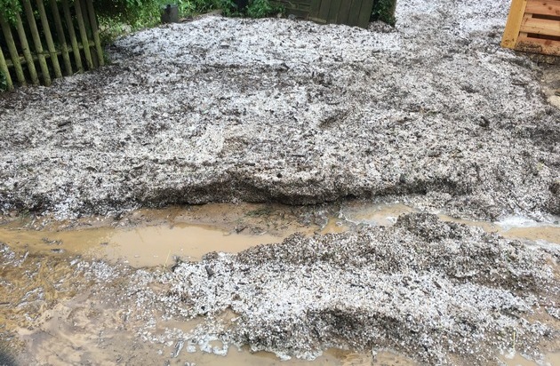 "Wir haben die Kräfte auf die Einsatzstellen aufgeteilt", erklärt der stellvertretende Wehrleiter Nils Vollmar. Vollmar selbst fuhr mit einem Teil der Mannschaft zum Angerweg. Zunächst sah es aus, als wäre großflächig Kies auf dem Hof verteilt worden. "So etwas habe ich noch nicht gesehen", schildert Vollmar. "Wir haben hier mit viel Wasser gerechnet, aber nicht mit Schlamm und Hagel." Der kurzzeitige, starke Hagelfall löste Teile des oberhalb liegenden Feldes und spülte diese bergab. Große Flächen des Hofes waren mit Schlamm bedeckt, viele Teile zudem ca. 30 cm hoch mit Hagelkörnern. Eine Kellergarage war über einen Meter hoch mit Hagel gefüllt. Vollmar selbst versank bis zum Oberschenkel in einer Masse aus Schlamm, Hagelkörnern und Wasser, als er einen Schritt zuviel in die falsche Richtung wagte. "Gehört dazu", schmunzelt er.