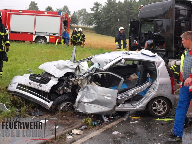 Zu einem Verkehrsunfall musste heute um 13:16 Uhr die Feuerwehr Iserlohn ausrücken. Bei dem Unfall auf der Bundesstraße 233, der Drüpplingser Straße, waren ein PKW und ein LKW zusammengestoßen. Hierbei wurde die Fahrerin des PKW in ihrem Auto eingeklemmt und schwer verletzt.
