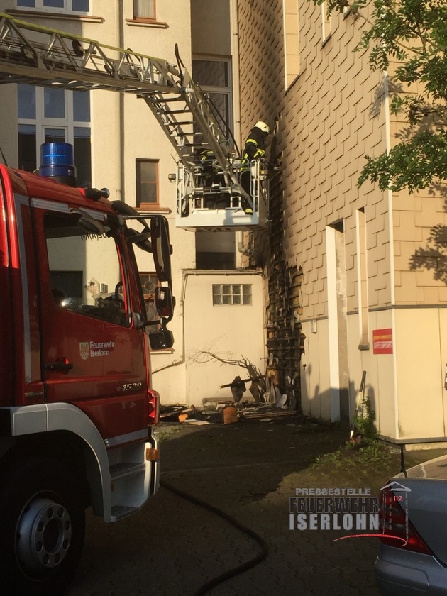 Um 19:25 wurde die Feuerwehr Iserlohn zu einem Feuer in die Unnaer Straße gerufen. Auf der Rückseite eines Wohn- und Geschäftshauses brannte Sperrmüll und weiterer Unrat. Das Feuer hatte bereits auf die Wärmedämmung der Hausfassade übergegriffen. Durch einen zügigen Löschangriff mit einem C-Rohr konnte ein größerer Schaden verhindert werden. Zur Kontrolle der Fassade auf weitere Glut- und Brandnester wurde die Drehleiter eingesetzt. Im Einsatz befanden sich der Löschzug der Berufsfeuerwehr und die Polizei.