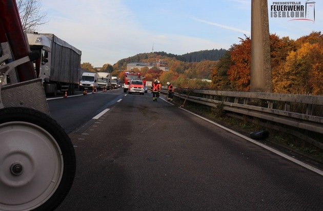 Um 08:13 Uhr wurde die Berufsfeuerwehr Iserlohn zu einem Verkehrsunfall auf der Autobahn 46 in Richtung Hemer, kurz vor der Anschlussstelle Letmathe, gerufen. Eine Motorradfahrerin hatte vermutlich die Kontrolle über ihre Maschine verloren und war gestürzt. Hierbei verletzte sie sich schwer. Ersthelfer sicherten die Unfallstelle ab und kümmerten sich um die Verletzte. Nach dem die Einsatzkräfte von Feuerwehr und Rettungsdienst eingetroffen waren, übernahmen sie die Absicherung und die weitere Versorgung der Patientin. Mit notärztliche Begleitung wurde sie in ein Hagener Krankenhaus transportiert. Am Motorrad austretende Betriebsmittel wurden abgestreut.