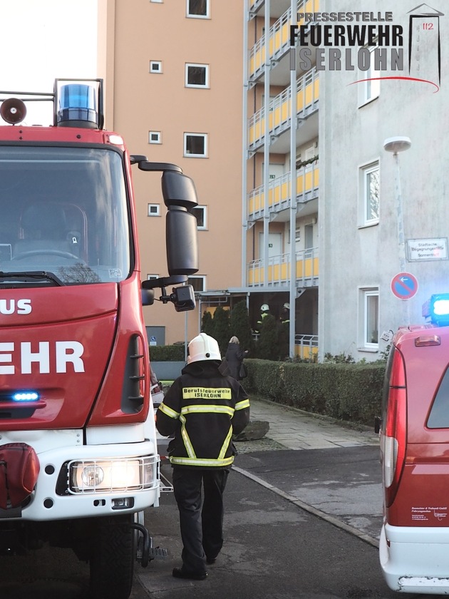 Mit der Meldung "Brandgeruch im Hochhaus" wurde die Feuerwehr Iserlohn am Freitag gegen 14:30 Uhr zum Sonnenweg im Dröscheder Feld alarmiert. Vor Ort wurden die Einsatzkräfte von Anwohnern auf eine verrauchte Wohnung im Erdgeschoss des mehrstöckigen Gebäudes aufmerksam gemacht. In der Wohnung befand sich zu diesem Zeitpunkt noch eine Person, die direkt ins Freie geleitet und dem Rettungsdienst übergeben wurde. In der Wohnung war es zum Brand eines Möbelstückes gekommen. Das Feuer war schnell unter Kontrolle, ein Trupp unter Atemschutz kontrollierte die Wohnung auf weitere Personen, um anschließend Belüftungsmaßnahmen mittels Hochleistungslüfter einzuleiten. Der Einsatz war nach ca. 30 Minuten beendet, die alarmierten Löschgruppen Ober- und Untergrüne der Freiwilligen Feuerwehr wurden nicht benötigt und konnten ihre Einsatzübernahme abbrechen.