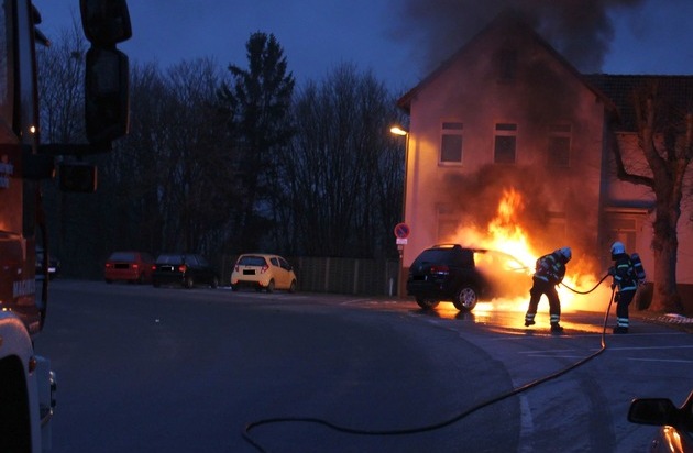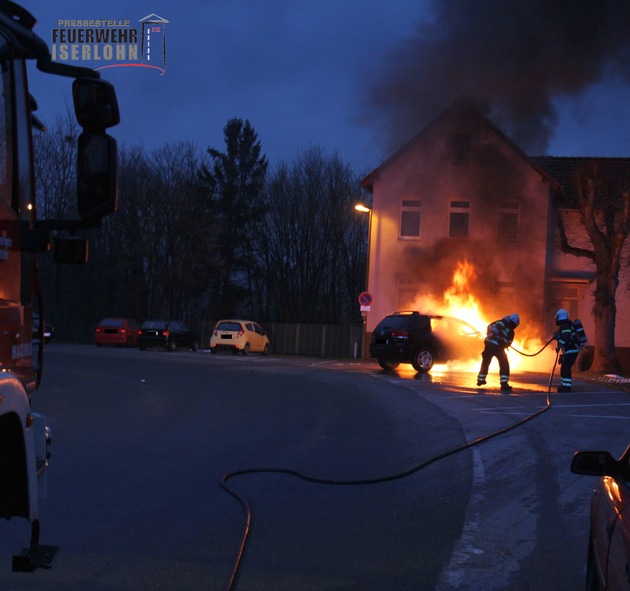 Um 07:13 Uhr wurde der Einsatzzentrale der Berufsfeuerwehr Iserlohn ein PKW Brand an der Immermannstraße gemeldet. Bei Eintreffen der Berufsfeuerwehr brannte der VW Touareg bereits im vorderen Bereich in voller Ausdehnung. Die Einsatzkräfte erhielten noch auf der Anfahrt den wichtigen Hinweis, dass das Fahrzeug auch mit Gas betrieben wird und somit auch ein Gastank verbaut ist. Dementsprechend vorsichtig gingen die Einsatzkräfte mit einem C Rohr unter Atemschutz vor. Das Feuer war schnell unter Kontrolle. Mit einer sogenannten Schaumpistole wurden die letzten Glutnester abgelöscht. Die Sicherheitseinrichtungen der Gasanlage haben entsprechend funktioniert.