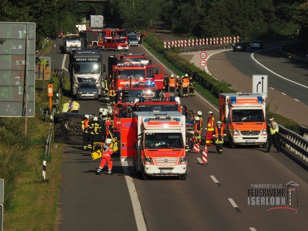 Um 18:05 Uhr wurde der Einsatzzentrale der Berufsfeuerwehr Iserlohn ein Verkehrsunfall auf der Autobahn 46, kurz vor der Anschlussstelle Iserlohn-Seilersee in Fahrtrichtung Hagen mit eingeklemmten Personen, gemeldet. Ein Toyota Auris war aus unbekannten Gründen von der Fahrbahn abgekommen, hat sich überschlagen und blieb seitlich auf der Fahrerseite liegen. Der Fahrer, sonst befand sich niemand im Fahrzeug, war eingeklemmt und musste patientenorientiert gerettet werden. Hierfür wurde das Fahrzeug stabilisiert, der Patient im Fahrzeug durch den Rettungsdienst versorgt und in Absprache mit dem Notarzt das Dach des Fahrzeugs an den Holmen der Beifahrerseite abgeschnitten und dann abgeklappt. Der Patient konnte so mit einem Spineboard aus dem Fahrzeug befreit werden. Nach der ersten Versorgung in einem Rettungswagen, wurde der Patient mit dem angeforderten Rettungshubschrauber, "Christoph 8 aus Lünen", in ein Krankenhaus nach Dortmund geflogen. Während der Rettungsarbeiten war die Autobahn in Richtung Hagen gesperrt. Vor Ort im Einsatz waren der Rüstzug der Berufsfeuerwehr, der Rettungsdienst aus Iserlohn und Hemer, sowie die Löschgruppen Stadtmitte, Bremke und Iserlohner Heide der Freiwilligen Feuerwehr.