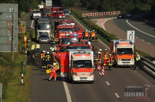 Um 18:05 Uhr wurde der Einsatzzentrale der Berufsfeuerwehr Iserlohn ein Verkehrsunfall auf der Autobahn 46, kurz vor der Anschlussstelle Iserlohn-Seilersee in Fahrtrichtung Hagen mit eingeklemmten Personen, gemeldet. Ein Toyota Auris war aus unbekannten Gründen von der Fahrbahn abgekommen, hat sich überschlagen und blieb seitlich auf der Fahrerseite liegen. Der Fahrer, sonst befand sich niemand im Fahrzeug, war eingeklemmt und musste patientenorientiert gerettet werden. Hierfür wurde das Fahrzeug stabilisiert, der Patient im Fahrzeug durch den Rettungsdienst versorgt und in Absprache mit dem Notarzt das Dach des Fahrzeugs an den Holmen der Beifahrerseite abgeschnitten und dann abgeklappt. Der Patient konnte so mit einem Spineboard aus dem Fahrzeug befreit werden. Nach der ersten Versorgung in einem Rettungswagen, wurde der Patient mit dem angeforderten Rettungshubschrauber, "Christoph 8 aus Lünen", in ein Krankenhaus nach Dortmund geflogen. Während der Rettungsarbeiten war die Autobahn in Richtung Hagen gesperrt. Vor Ort im Einsatz waren der Rüstzug der Berufsfeuerwehr, der Rettungsdienst aus Iserlohn und Hemer, sowie die Löschgruppen Stadtmitte, Bremke und Iserlohner Heide der Freiwilligen Feuerwehr.