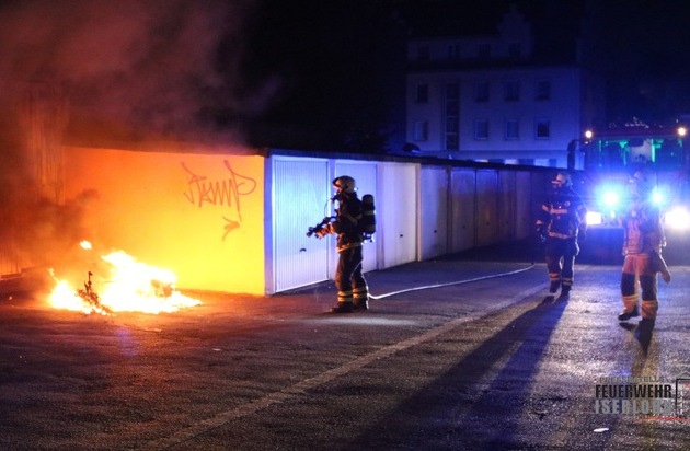 Mehrere Notrufe meldeten am Sonntagabend gegen 22:20 Uhr Feuerschein in einem Garagenhof an der Duesbergstraße. Sie vermuteten einen Garagenbrand. Bei Eintreffen des Löschzugs der Berufsfeuerwehr brannte im Garagenhof ein Motorroller in voller Ausdehnung. Das Feuer wurde mit einem C-Rohr unter Atemschutz gelöscht. Die Garagen wurden nicht beschädigt. Die mitalarmierte Löschgruppe Stadtmitte der Freiwilligen Feuerwehr konnte den Einsatz abbrechen. Die Ermittlung zur Brandursache und der Schadenshöhe hat die Polizei übernommen. Personen kamen nicht zu Schaden.