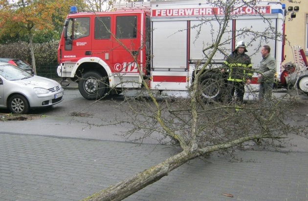 Ein weiterer umgestürzter Baum wurde um 11:37 Uhr "Im Oberdorf" in Iserlohn-Letmathe gemeldet. Hier wurde ebenfalls ein am Straßenrand abgestelltes Fahrzeug beschädigt. Auch dieser Baum wurde mit der Motorkettensäge zerteilt und am Rand abgelegt. Beide Einsätze wurden von vier Beamten der Berufsfeuerwehr mit dem Hilfeleistungslöschfahrzeug abgearbeitet.