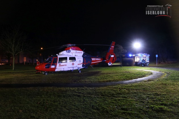 Gegen 18:30 Uhr wurde auf der Mendener Straße, in Höhe der Bädekerstraße, eine Person von einem Fahrzeug erfasst und schwer verletzt. Für den Transport der lebensgefährlich verletzten Person in eine Spezialklinik nach Bochum wurde vom Rettungsdienst ein Rettungshubschrauber alarmiert. Zur Einsatzstelle kam der Rettungshubschrauber "Akkon Bochum". Der erst am 01.11.2016 in Dienst gestellte Intensivtransporthubschrauber (ITH) der Johanniter Unfallhilfe ist Nachtflugtauglich und rund um die Uhr einsatzbereit. Stationiert ist er am Flugplatz Marl-Loemühle. In Iserlohn war der ITH das erste Mal im Einsatz.