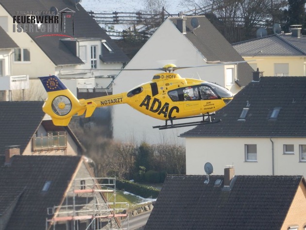 Wegen einer schweren Verletzung nach einem häuslichen Unfall am Heimbergweg, forderte der Rettungsdienst der Berufsfeuerwehr Iserlohn um 12:35 Uhr für den Transport in eine Spezialklinik nach Dortmund den Rettungshubschrauber (RTH) "Christoph 8" aus Lünen an. Zur Absicherung des Lande- und Startplatzes, sowie zur Unterstützung des Rettungsdienstes am Unfallort, entsendete die Einsatzzentrale den Einsatzleitwagen, das Hilfeleistungslöschfahrzeug und das Tanklöschfahrzeug der Berufsfeuerwehr.