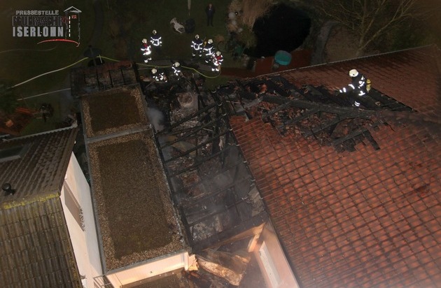 Um 02:48 Uhr wurde der Einsatzzentrale der Berufsfeuerwehr ein brennendes Gartenhaus an der Hennener Bahnhofstraße gemeldet. Bei Eintreffen des Löschzugs der Berufsfeuerwehr war das Feuer bereits auf die angrenzende Garage und dem Dachstuhl des Wohnhauses übergegangen. Die Bewohner hatten das Einfamilienhaus verlassen und die Nachbarn des Nachbarhauses gewarnt. Die Alarmstufe wurde auf Feuer 2 erhöht. Sofort wurden massive Löschmaßnahmen eingeleitet. Mehrere Trupps von Berufs- und Freiwilliger Feuerwehr nahmen unter Atemschutz zur Brandbekämpfung vier C-Rohre vor. Außerdem kam das Wenderohr der Drehleiter zum Einsatz. So konnte ein Übergreifen der Flammen auf das gesamte Wohnhaus und auf das Nachbarhaus verhindert werden. Hier war bereits die Rollade geschmolzen und von der Doppelverglasung des Fensters eine Scheibe geplatzt. In der Garage fiel unter anderem ein Fahrzeug den Flammen zum Opfer. Personen kamen nicht zu Schaden. Die Polizei hat die Ermittlungen zur Brandursache und zur Schadenshöhe aufgenommen. Ab 05:30 Uhr verblieb für eventuelle Nachlöscharbeiten eine Brandsicherheitswache. Im Einsatz waren der Löschzug der Berufsfeuerwehr, der Rettungsdienst sowie die Löschgruppen Hennen, Drüpplingsen und Leckingsen der Freiwilligen Feuerwehr mit insgesamt 45 Einsatzkräften. Die entblößte Feuerwache wurde durch die Löschgruppen Bremke und Iserlohner Heide sowie der zweiten Drehleiter der Löschgruppe Letmathe besetzt.