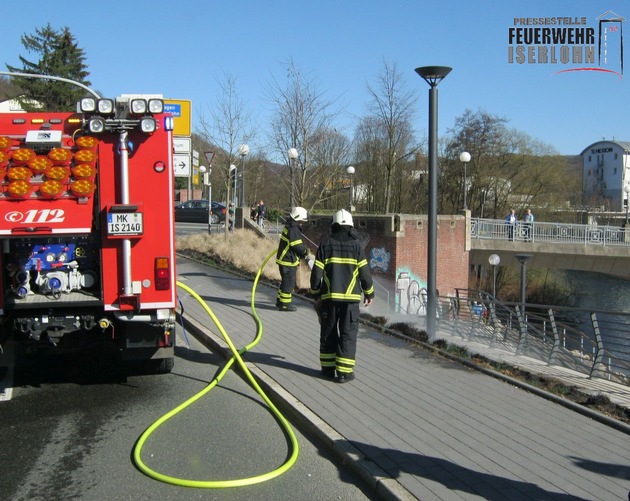An der neu gestalteten Promenade am Lennedamm brannten gegen 16:00 Uhr etwa 50 Quadratmeter trockene Grasnarbe. Mit einem C-Rohr löschten die Einsatzkräfte der Berufsfeuerwehr den Brand. Weil es durch das Feuer zu einer sehr starken und weithin sichtbaren Rauchentwicklung kam, gingen in der Einsatzzentrale der Berufsfeuerwehr Iserlohn etwa 20 Notrufe für das Ereignis ein. Personen kamen nicht zu Schaden.