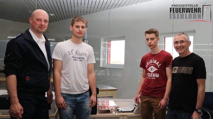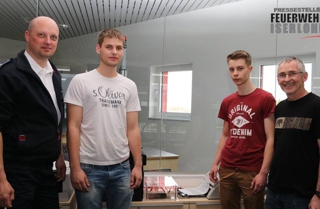 Zur Übergabe und Inbetriebnahme der mit Lichtschranken und jeder Menge Elektronik ausgestatteten Alarmeinrichtung kamen jetzt (v.r.n.l.) Olaf Igla (Lehrer), Tobias Pospischil und Ole Schmüse als Abordnung der Klasse 15 ME zur Feuerwache. Christopher Rosenbaum (links), verantwortlich für die Einsatzzentrale der Iserlohner Feuerwehr, freute sich über das gelungene Projekt und sprach der Delegation, stellvertretend für die gesamte Klasse, seinen herzlichen Dank aus. "Alle Schüler waren mit viel Ehrgeiz und großem Engagement bei der Sache", so Olaf Igla. "Endlich einmal ein Projekt, das nach der Fertigstellung einen wirklich sinnvollen Dienst verrichten wird".