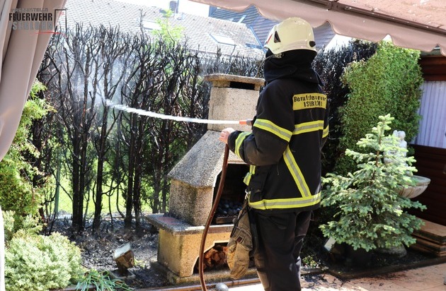 Um 11:39 Uhr meldeten mehrere Anrufer über den Notruf 112 eine starke Rauchentwicklung von der "Kampstraße". Im Garten eines Grundstücks war beim Entzünden eines Grills eine etwa 5 Meter lange Lebensbaumhecke in Brand geraten. Die Eigentümer hatten bereits mit einem Gartenschlauch die ersten Brandbekämpfungsmaßnahmen eingeleitet. Der Löschzug der Berufsfeuerwehr übernahm das Ablöschen der Glutnester. Die Plane eines aufgebauten Pavillons wurde durch den Funkenflug ebenfalls beschädigt. Die mit alarmierten Einheiten der Freiwilligen Feuerwehr brauchten nicht mehr eingreifen.