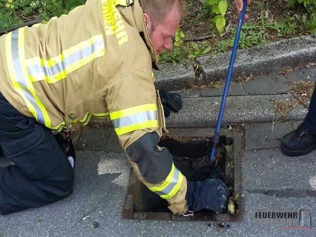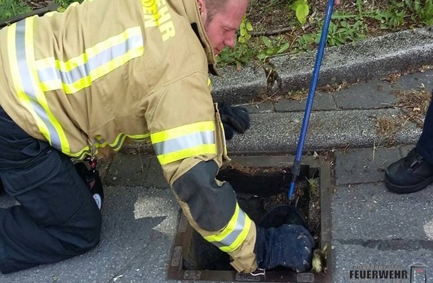 An der Einsatzstelle konnte der Kanaleinlauf sofort ausfindig gemacht werden, denn die Entenmutter lief aufgeregt flatternd und schnatternd um den Gully herum. Nachdem der Kanaldeckel von den Einsatzkräften entfernt wurde, konnten neun Küken gezählt werden, die nicht aus eigener Kraft aus dem Kanaleinlauf heraus kamen. Brandmeisteranwärter Robin Gottschall hob die Küken einzeln in einen Kescher, mit dem sie dann zur wartenden Entemutter ins Gras gesetzt wurden.