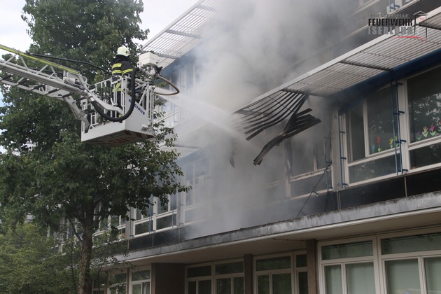 Gegen 13:00 Uhr wurde der Feuerwehr telefonisch von der Kilianschule ein Brand gemeldet. Bereits auf der Anfahrt konnten die Einsatzkräfte von der Autobahn aus eine starke Rauchentwicklung sehen. Daraufhin wurde das Alarmstichwort auf "Feuer 2" erhöht. Bei Eintreffen der Einsatzkräfte brannte ein Klassenraum im ersten Obergeschoss in voller Ausdehnung und drohte auf weitere Räume überzugreifen. In der Anfangsphase wurde ein Mädchen vermisst. Daher setzte der Einsatzleiter sofort mehrere Trupps unter Atemschutz mit C-Rohren zur Personenrettung ein. Zum Glück wurde das Mädchen im Freien unverletzt aufgefunden. Zur Personensuche und der Brandbekämpfung setzten die Einsatzkräfte insgesamt vier C-Rohre ein. Ein C-Rohr über die Drehleiter. Durch den Brandrauch sind weitere Räume betroffen. Zur Betreuung von Schülern, Lehrern und Eltern wurden die Notfallseelsorger alarmiert. Die Brandursache und die Schadenshöhe werden durch die Polizei ermittelt. Vor Ort im Einsatz waren der Löschzug der Berufsfeuerwehr, ein Rettungswagen und das Notarzteinsatzfahrzeug aus Iserlohn, ein Rettungswagen der Feuerwehr Menden sowie die Löschgruppen Obergrüne, Letmathe, Oestrich und Stübbeken mit insgesamt 45 Einsatzkräften. Die Feuerwache wurde durch die Löschgruppen Stadtmitte, Bremke und Iserlohner Heide besetzt. Ab 14:30 Uhr verblieb noch eine Brandsicherheitswache durch die Freiwillige Feuerwehr an der Einsatzstelle.