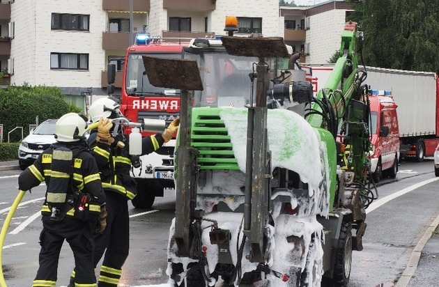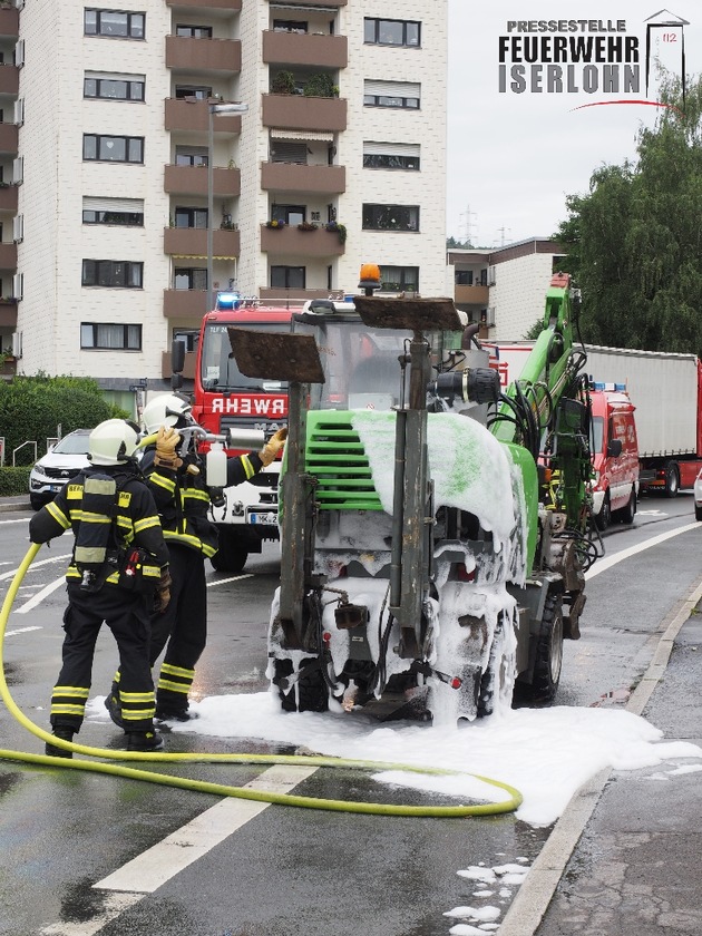 Am Freitag, um 11:57 Uhr, bemerkte der Fahrer eines Bauunternehmens, bei dessen Überfahrt auf der Straße Hellweg, dass sein Fahrzeug in Brand geraten war und verständigte die Feuerwehr. Die angerückten Kräfte nahmen unter Atemschutz ein C-Rohr vor. Im weiteren Einsatzverlauf kam eine Schaumpistole zum Einsatz. Aufgrund von auslaufenden Betriebsmitteln wurden zwei Kanaleinläufe mit sogenannten Gullydichtkissen verschlossen und Bindemittel aufgetragen. Ein Spezialunternehmen nahm das Bindemittel am Ende des Einsatzes auf. Zur Zeit des gesamten Einsatzes wurde der Hellweg zwischen dem Kreuzungsbereich Kampstraße/Kuhloweg einseitig gesperrt. Es waren 10 Einsatzkräfte der Feuerwehr Iserlohn für ca. 90 Minuten im Einsatz.