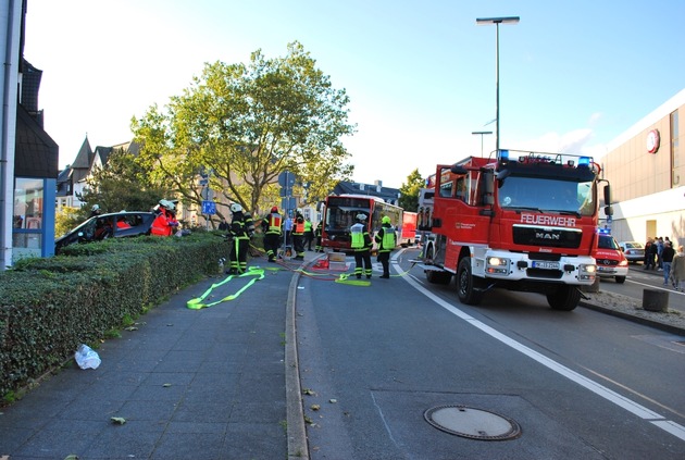 Gegen 18 Uhr kollidierten ein PKW und Linienbus auf dem Kurt-Schumacher-Ring in der Iserlohner Innenstadt. Der mit drei Personen besetzte PKW wurde bei dem Zusammenprall in eine Grünfläche geschleudert und kam an der Hauswand des Lutherhauses zum Stehen. Glücklicherweise befanden sich zum Unfallzeitpunkt keine Fahrgäste - ausgenommen der Fahrer - im Linienbus.