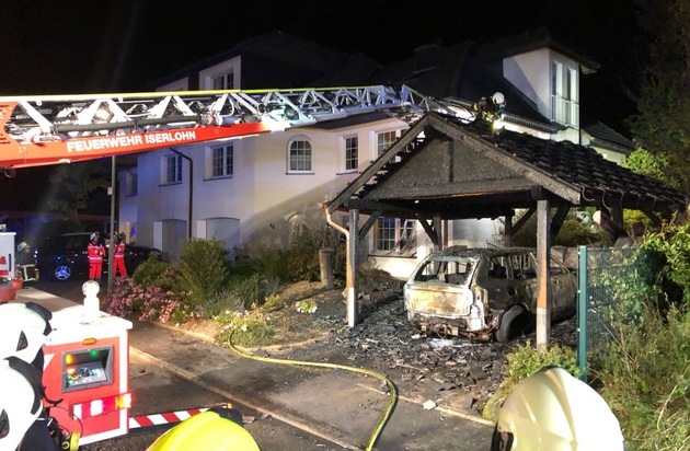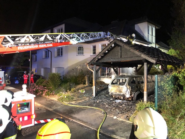 In der Nacht zum Montag wurden um 02:25 Uhr Berufs- und Freiwillige Feuerwehr zu einem Fahrzeugbrand an der Straße "Kuhlenstück" gerufen. Bei Eintreffen der Berufsfeuerwehr brannten ein unter einem Carport abgestellter Volvo und das Carport in voller Ausdehnung. Das Feuer drohte bereits auf das direkt angrenzende Doppelhaus überzugreifen. Die Flammen schlugen bis zum Dach des Hauses. Fensterrollos waren aufgrund der Wärmestrahlung geschmolzen und eine Fensterscheibe geplatzt. Durch die Einsatzkräfte der Berufsfeuerwehr wurden sofort zwei C-Rohre unter Atemschutz eingesetzt. Im weiteren Verlauf kam am Fahrzeug auch ein Schaumrohr zum Einsatz. Ein Übergreifen auf das Wohnhaus konnte somit verhindert werden. Um alle Glutnester abzulöschen, wurde über die Drehleiter die Dachfläche des Carports komplett aufgenommen. Mit einer Wärmebildkamera wurde das Wohnhaus von außen und innen gründlich kontrolliert. Personen kamen nicht zu Schaden. Brandursache und Schadenshöhe werden durch die Polizei ermittelt. Im Einsatz waren der Löschzug der Berufsfeuerwehr, der Rettungsdienst und die Löschgruppe Oestrich der Freiwilligen Feuerwehr. Der Einsatz konnte um 04:00 Uhr beendet werden.