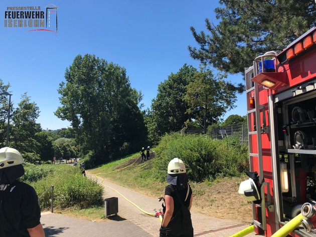 Um 13:57 Uhr wurde die Berufsfeuerwehr zu einer unklaren Rauchentwicklung Richtung Iserlohn-Drüpplingsen alarmiert. Noch auf der Anfahrt zur Einsatzstelle kam die Rückmeldung über die Leitstelle Unna, dass das Feuer im Kreis Unna ist. Nahezu zeitgleich kam eine Meldung über ein Flächenbrand am Alexander-Pfänder-Weg. Zu diesem Einsatz wurden die Löschgruppen Bremke und Iserlohner Heide der Freiwilligen Feuerwehr alarmiert. Unterhalb der Schule brannten etwa 50 Quadratmeter Wiese und Bewuchs. Die Kräfte der Löschgruppen nahmen ein C-Rohr zur Brandbekämpfung vor. Die nachrückende Einheit der Berufsfeuerwehr stellte mit dem Tanklöschfahrzeug die Wasserversorgung sicher. Um 14:50 Uhr konnte "Feuer aus" gemeldet werden. Verletzt wurde niemand.