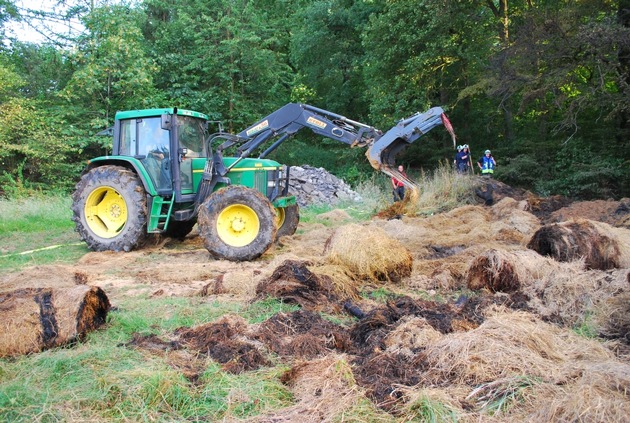 Am heutigen Samstagabend musste die Feuerwehr Iserlohn zu einem Bauernhof an der Rheinener Straße ausrücken. Gegen 19 Uhr waren dort Strohballen und Wiesenfläche an einem Waldrand in Brand geraten. Zur Brandbekämpfung wurden zwei C-Rohre unter Atemschutz eingesetzt, die Löschwasserversorgung konnte aus einem Unterflurhydranten auf dem Hof sichergestellt werden. Zum Einsatz kam außerdem der Traktor eines Landwirtes, mit dem das Brandgut auseinandergezogen wurde. Hierdurch konnte das Feuer schnell unter Kontrolle gebracht und ein Übergreifen der Flammen auf den angrenzenden Wald verhindert werden. An dem über zweistündigen Einsatz waren rund 60 Einsatzkräfte von Berufs- und Freiwilliger Feuerwehr beteiligt. Zur Brandursachen hat die Polizei die Ermittlungen aufgenommen.