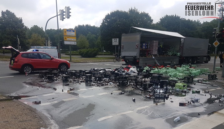 Gegen 11:30 Uhr bog ein Getränkelaster von der Hembergstraße auf die Baarstraße. Im Kreuzungsbereich zur Theodor-Fleitmann-Straße kippten die verschiedensten Getränkekisten aus dem LKW auf die Fahrbahn. Die alarmierten Einsatzkräfte der Berufsfeuerwehr sicherten zusammen mit der Polizei die "Unfallstelle" ab. Nach ersten unterstützenden Aufräumarbeiten wurde die Einsatzstelle an die Stadtbetriebe Iserlohn-Hemer (SIH) übergeben.