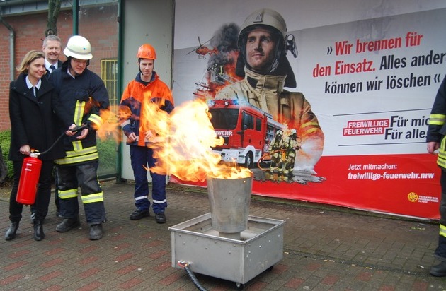 "Für mich, für alle" ist daher nur folgerichtig der Slogan, mit dem das Land und der Verband der Feuerwehren jetzt für die Arbeit der Einheiten werben. Über den Startschuss der Kampagne in Haan freut sich auch Bürgermeisterin Dr. Bettina Warnecke, die an einem der Großplakate die neue Feuerlöschübungsanlage testete, mit der die Feuerwehr Haan Brandschutzaufklärung in der Bevölkerung leistet. "Die Kampagne zeigt, wie vielfältig und spannend die Aufgaben in der Freiwilligen Feuerwehr heutzutage sind. Hier sind die unterschiedlichsten Talente gefragt. Jeder ist herzlich eingeladen, die tolle Gemeinschaft der Haaner Feuerwehr einmal unverbindlich kennenzulernen", sagte die Bürgermeisterin.