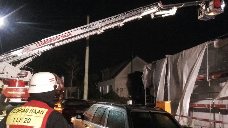 Um 18.45 Uhr war die Feuerwehr zur Düsseldorfer Straße gerufen worden, weil an der Baustelle eines Baumarkts der Bauzaun auf einer Länge von etwa 60 Metern umgestürzt war. Die Feuerwehr richtete diesen wieder auf und sicherte ihn. Darüber hinaus wirkte das an einem Bauteil installierte Gerüst aufgrund einer angebrachten Folie, die wie ein Segel wirkte, zu instabil. In Absprache mit einem Verantwortlichen wurde die Folie daher von der Feuerwehr entfernt.