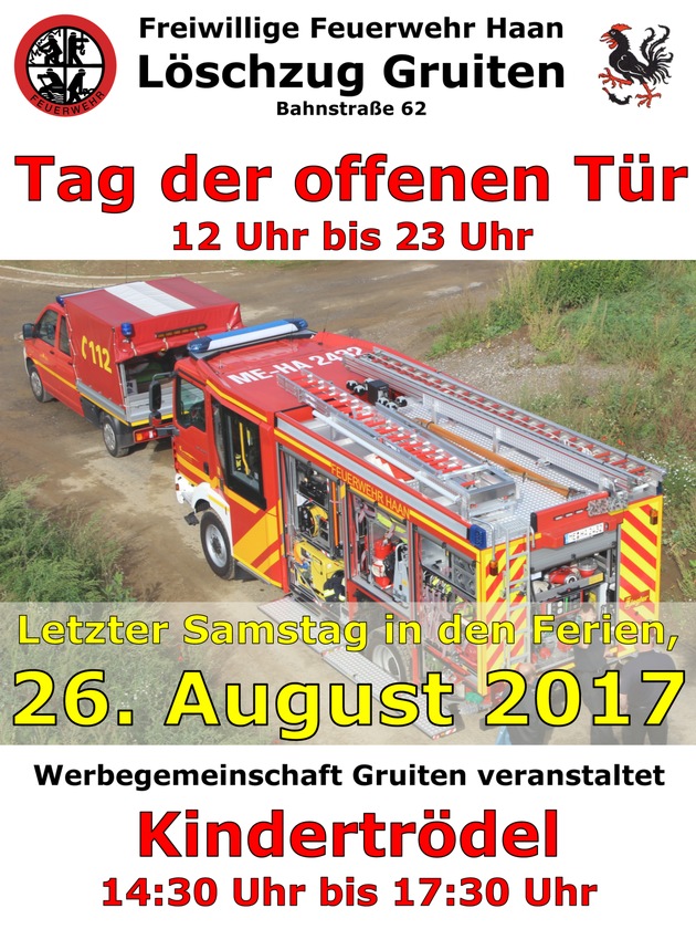 Zum Tag der offenen Tür lädt der Löschzug Gruiten der Freiwilligen Feuerwehr Haan am Samstag, 26. August, ans und ins Gerätehaus an der Bahnstraße 62 ein. Beginn ist um 12 Uhr.