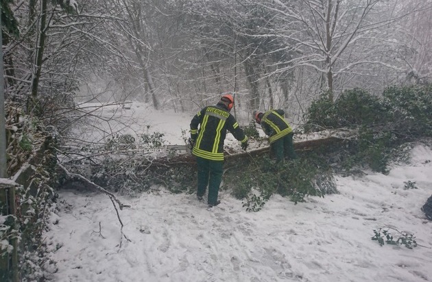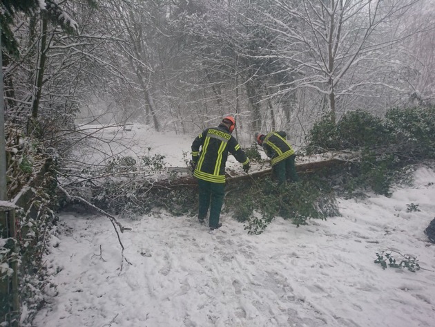 Nach den erneuten starken Schneefällen sind der Feuerwehr Haan auch heute wieder mehrere umgestürzte Bäume gemeldet worden. Seit 12.11 Uhr sind alle Löschzüge alarmiert und im Stadtgebiet unterwegs. Einsatzstellen wurden von Pütt, Kalkstraße, Ittertalstraße, Walder Straße und Düsseler Mühle gemeldet. Nach acht Einsätzen am gestrigen Samstag wurden heute bislang sieben Einsatzstellen abgearbeitet. In der Regel blockierten Bäume Verkehrsbereiche und mussten beseitigt werden.