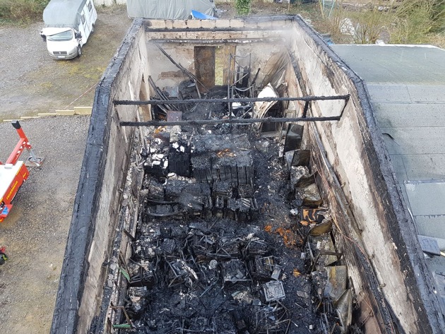 Nach Rücknahme aller Maßnahmen zeigt sich, dass neben der durch den Vollbrand zerstörten und einsturzgefährdeten Lagerhalle auch das angebaute Betriebsgebäude durch das Feuer erheblich in Mitleidenschaft gezogen worden ist. Über das Dach hat sich der Brand ins Innere ausgebreitet, wurde dort aber durch einen massiven Löschangriff unter Kontrolle gebracht, so dass der mit einem Sheddach versehene Anbau gehalten werden konnte. Das dortige Lagergut wurde durch Hitze und Ruß zerstört.