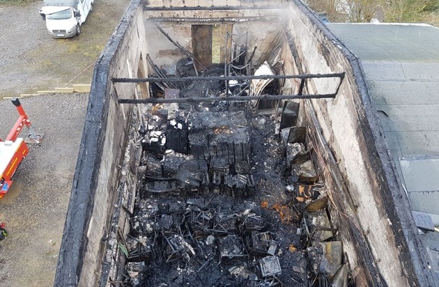 Nach Rücknahme aller Maßnahmen zeigt sich, dass neben der durch den Vollbrand zerstörten und einsturzgefährdeten Lagerhalle auch das angebaute Betriebsgebäude durch das Feuer erheblich in Mitleidenschaft gezogen worden ist. Über das Dach hat sich der Brand ins Innere ausgebreitet, wurde dort aber durch einen massiven Löschangriff unter Kontrolle gebracht, so dass der mit einem Sheddach versehene Anbau gehalten werden konnte. Das dortige Lagergut wurde durch Hitze und Ruß zerstört.