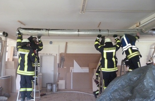 (09.04.15) Zu einem Feuer in einer Tischlerei im Azaleenweg wurden am heutigen Nachmittag gegen 14:42 Uhr das hauptamtliche Personal, die Löschgruppe Pivitsheide und der Löschzug Mitte gerufen. Vor Ort stellte sich heraus, dass sich in einem Absaugsystem für Sägespäne ein Schwelbrand entwickelt hatte. Um an die schwelenden Glutnester zu gelangen, mussten die Einsatzkräfte das Rohrsystem auf ca. 11 Metern Länge öffnen bzw. demontieren. Parallel wurde mit Hilfe einer Wärmebildkamera nach weiteren Glutnestern gesucht. Der Einsatz unter Leitung von Brandamtsrat Torsten Wiedemann war nach etwa 1,5 Stunden beendet. Verletzt wurde niemand. (MS)